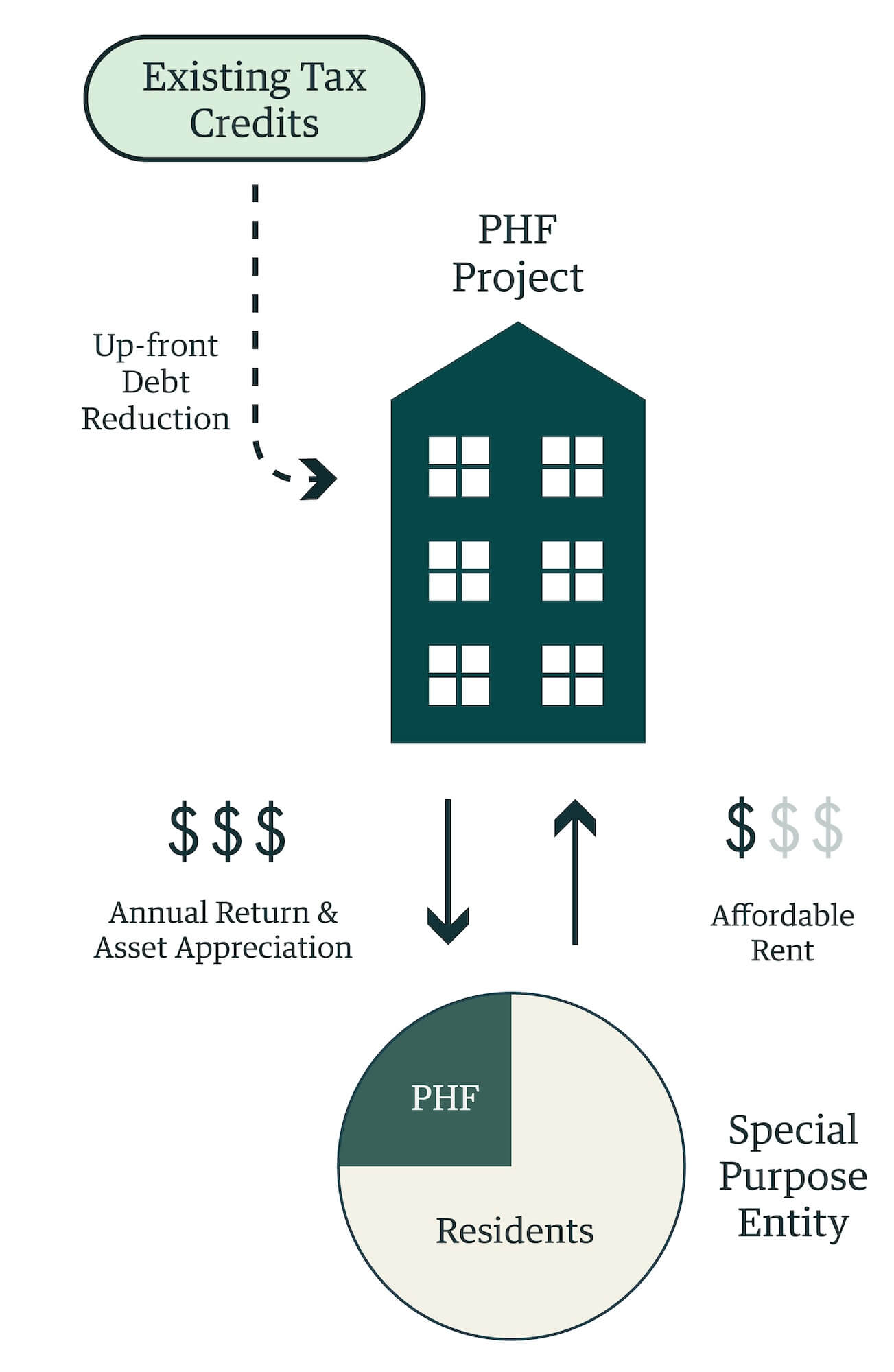 As a lean nonprofit with community-first capital sources, PHF is able to share the majority of all annual cashflow, long-term equity generation, and future refinance/sale proceeds with the residents living in a PHF project.